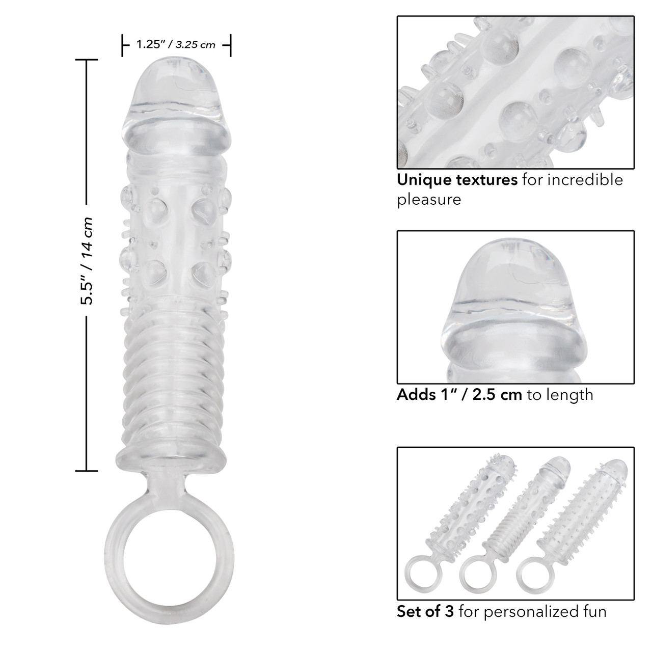 TEXTURED EXTENSION SET предназначен для увеличения длины, а благодаря специальным шипам насадки осуществляют дополнительную стимуляцию, эрекционное кольцо на конце насадки улучшит качество и увеличит продолжительность полового акта.