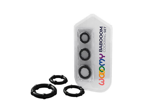 Babooom — набор из трех эластичных колец для пениса с диаметрами 2,5 см, 2,2 см и 2 см, разработанный для усиления эрекции и задержки оргазма. Кольца можно использовать по отдельности или вместе, регулируя интенсивность эффекта. Изготовлены из мягкого и безопасного TPE, они комфортны и не содержат фталатов. Вес набора — всего 23 г, что делает его легким и удобным. Водонепроницаемость IPX8 позволяет применять их в любых условиях. Текстура с небольшими шариками добавляет дополнительную стимуляцию для партнера. Цвет — черный.