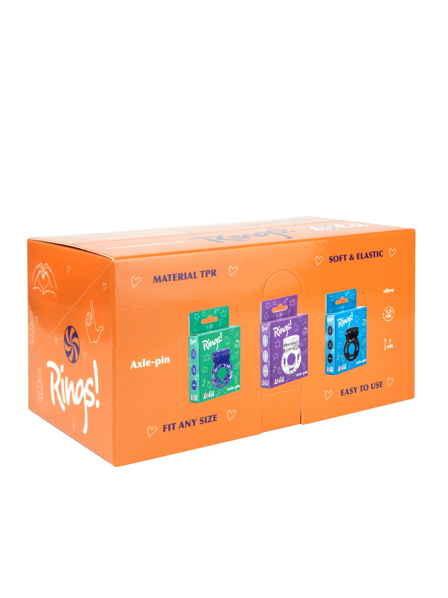 Шоубокс Axle-pin включает 12 эрекционных колец, представленных в трех стильных цветах, по четыре кольца каждого цвета. Эти кольца изготовлены из TPR — эластичного и приятного на ощупь материала, обеспечивающего комфорт при использовании. Эргономичная форма колец подходит для любого размера и гарантирует надежную фиксацию. Кольца разработаны для усиления стимуляции обоих партнеров, что обеспечивает более продолжительное удовольствие и стимуляцию различных эрогенных зон, включая клитор и мошонку. Каждое кольцо оснащено одним режимом вибрации, работающим от батареек-таблеток, которые входят в комплект.