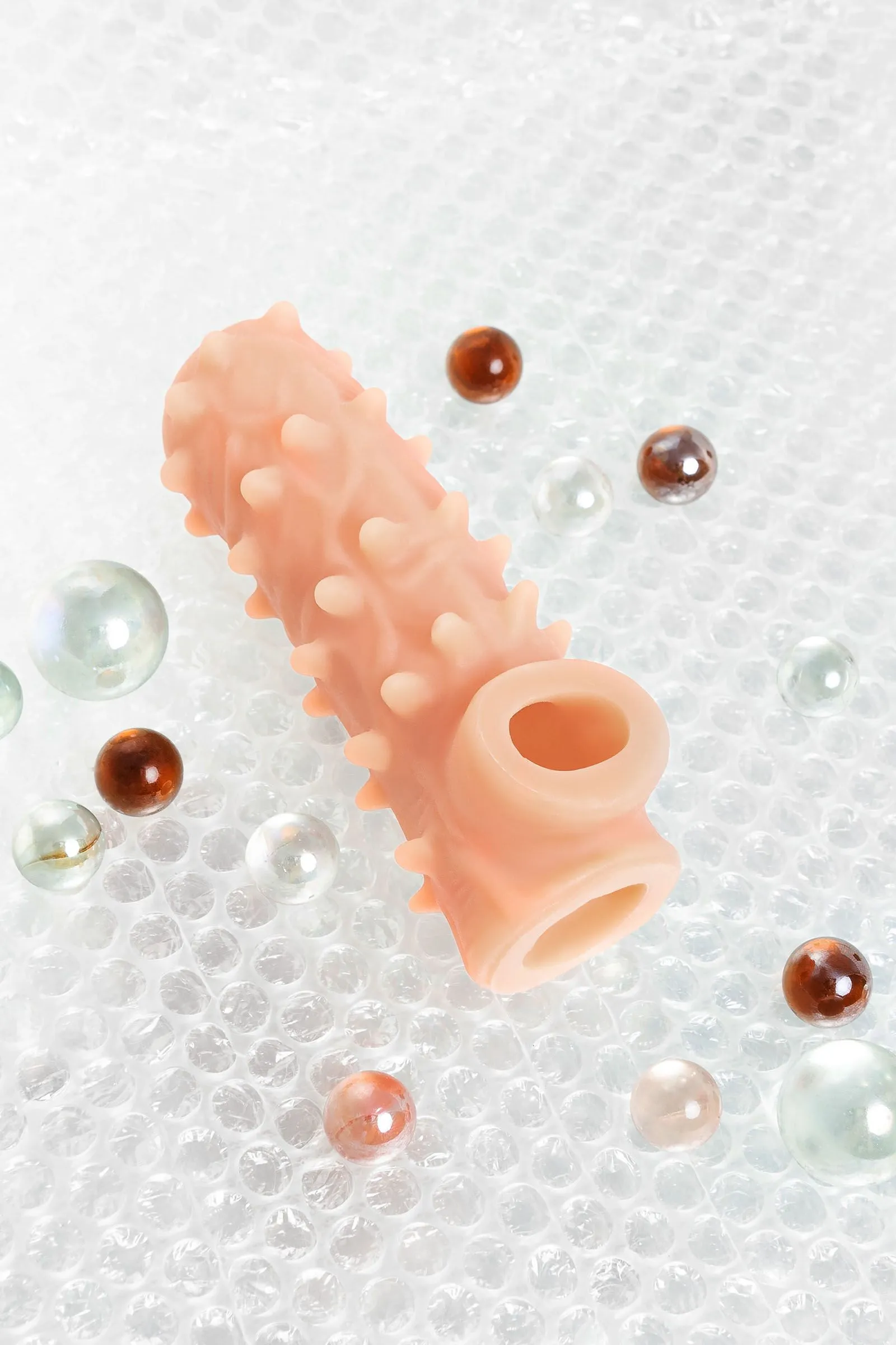 Открытая насадка с фантазийным рельефом от KOKOS предназначена воплотить фантазии о взаимном удовольствии. Реалистичная насадка на пенис - необходимый элемент для вашей сексуальной игры, если вы хотите максимально удовлетворить свою партнершу и сделать секс незабываемым. Откройте новые возможности: Увеличенный объем полового члена на 30% добавляет мужчине уверенности в своих сексуальных возможностях. Дополнительная стимуляция партнерши с помощью рельефа для яркого и насыщенного оргазма. Увеличение продолжительности полового акта у мужчины - задержка эякуляции, и наращивание темпа приближения оргазма у женщины. Насадка имеет форму “рукав”, плотно прилегает к пенису, создавая дополнительную толщину и оставляя головку открытой. Это позволяет сохранить чувствительность головки, задерживая эякуляцию. В основании есть отверстие для мошонки, с помощью которого вы надежно зафиксируете насадку на пенисе, не ограничиваясь в активных движениях. Насадка, за счет плотного облегания мошонки и головки, усиливает эрекцию. Ярко выраженный рельеф в виде многочисленных выпуклых вен и мягких шипов по всему стволу насадки стимулирует зону G, вход во влагалище и настойчиво ласкает чувствительные зоны. Дополнительный объем дарит то самое чувство наполненности, увеличивая поток возбуждения. Мужчина тоже будет ощущать стимуляцию за счет давления стенок влагалища на пенис. Супер эластичный материал быстро принимает температуру тела, отлично тянется, сохраняя при этом прочность. Нежное и мягкое покрытие такое же приятное на ощупь, как и человеческая кожа. Насадка сделана из высококачественного безвредного для человеческого организма материала, который прошел необходимые тестирования и сертификацию. Долговечность использования при соблюдении правил хранения и ухода за насадкой. Используйте с насадкой лубрикант только на водной основе. Длина: 12 см Диаметр: 4,0 см Размер: M Цвет: телесный Материал: TPE Страна бренда KOKOS: Корея