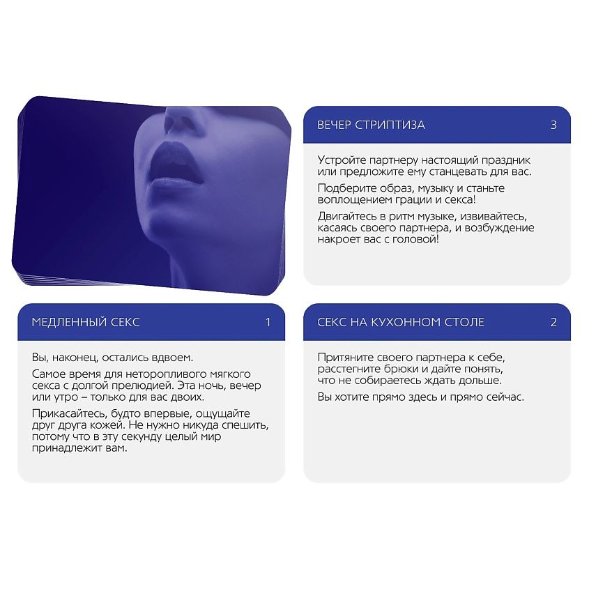 Этот набор позволит вам разнообразить сексуальную жизнь и добавить в неё немного перчинки. Вас ждут 5 карт с возбуждающими заданиями, а также чулки в сеточку, кружевная маска и пэстисы (специальные накладки на грудь). Что с этим делать? Да всё, что угодно. Главное, чтобы это принесло вам удовольствие!