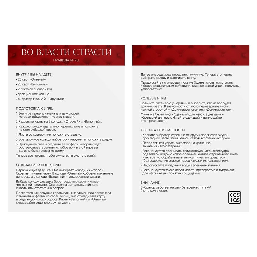 «Во власти страсти» – это серия эротических игр для двоих, главная особенность которой – большое количество ролевых игр и сценариев проведения романтического вечера. Серия включает себя карточные игры, наборы с аксессуарами, наборы кубиков и т.д.