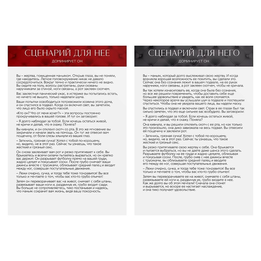 Эта игра позволит открыть своего партнёра с новой стороны, а также воплотить свои самые потаённые фантазии. Внутри вас ждут карты с пикантными вопросами и откровенными заданиями, а также сценарии для ролевой игры, которые помогут вам попробовать себя в роли рокового похитителя и его жертвы. А имеющиеся в комплекте аксессуары внесут в сексуальную жизнь новые эмоции и ранее неизведанные ощущения.