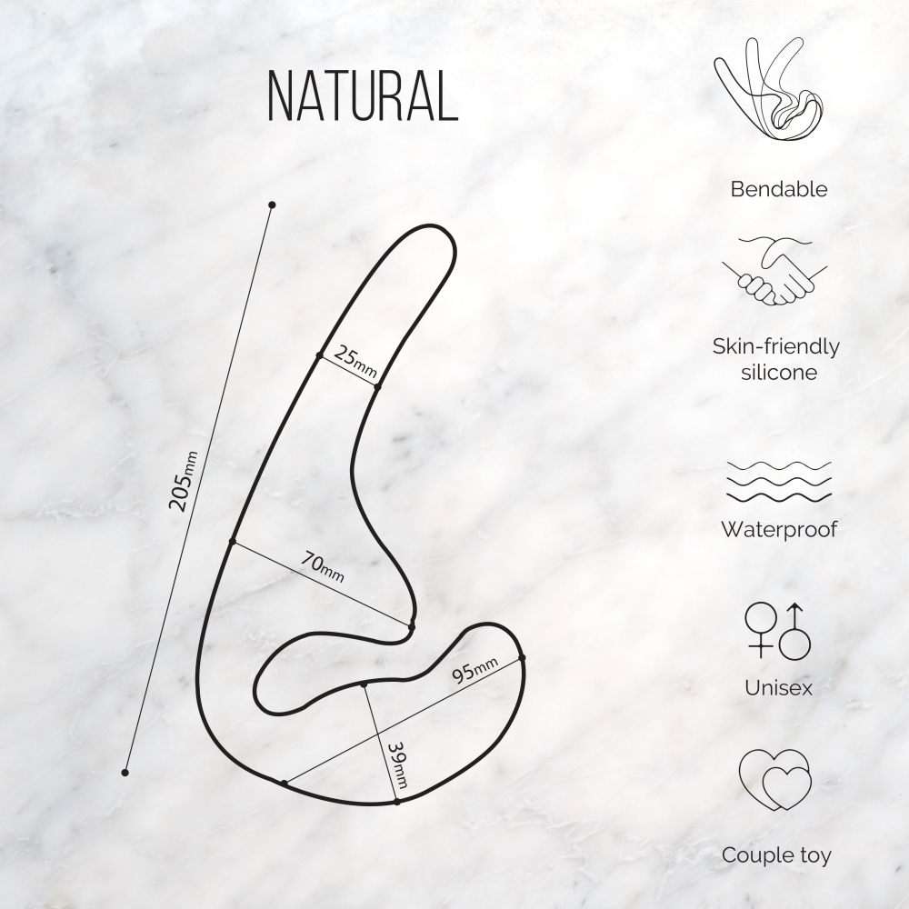 Natural Seduction - безремневой анальный страпон. Изготовлен из гипоаллергенного медицинского силикона. Эргономичная форма страпона помогает с легкостью удерживать игрушку мышцами влагалища. Также, страпон имеет клиторальный отросток для дополнительной стимуляции активного партнера во время фрикций. Размеры рабочей части специально созданы для анального проникновения. Отсутствие ремней и креплений освобождает и не сковывает бедра! Страпон рекомендуется использовать с лубрикантом на водной или силиконовой основе. Водонепроницаемый. Легок в уходе: до и после использования промыть в теплой воде, просушить и обработать той клинером для интимных игрушек. Материал: Силикон. Общая длина - 20,5 см, длина рабочей части - 10 см, диаметр рабочей части - 2,5 см, длина удерживающей части - 9,5 см, диаметр удерживающей части - 3,9 см, высота клиторальной части - 7 см.