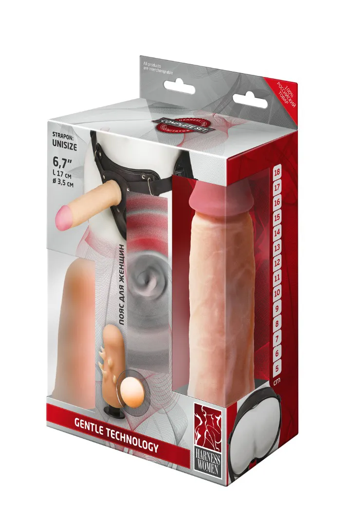 Новый и безумно-функциональный Harness-пояс для девушек. В комплект входят пояс-трусики и пара насадок. Это - отличная альтернатива для двухголовых фаллоимитаторов. Ваши руки останутся свободными для других более интересных занятий с партнером! Конструкция трусиков такова, что позволяет использовать абсолютно любые насадки, которые легко крепятся при помощи штырьков, входящих в комплект. Внутренняя поверхность трусиков мякгая, не имеет швов, легко регулирутся по размеру - что немаловажно. Два отверстия: одно внешнее - для любых насадок, на которые только способна ваша фантазия, второе - внутреннее, для вагинального проникновения хозяйки трусиков. В данном комплекте две насадки разных размера и формы. Фаллоимитатор в виде члена с ярковыраженной головкой и венами длиной 17 см и диаметром 3,5 см выполнен из мягкой Киберкожи. Вторая насадка имеет эргономичную компактную форму, идеально подходящуюю для роли вагинального отростка:немного загнутую головку и гладкую поверхность. Длина - 11,5 см, диаметр - 3,5 см.