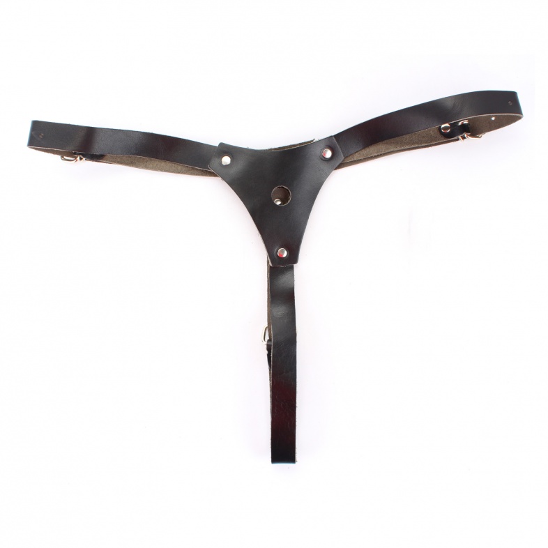 Чёрные трусики со штырьком для насадок. Размер регулируется ремешками (ширина 1,6 см), которые крепятся на бёдрах. Состав- натуральная кожа, металл, полимерные материалы.