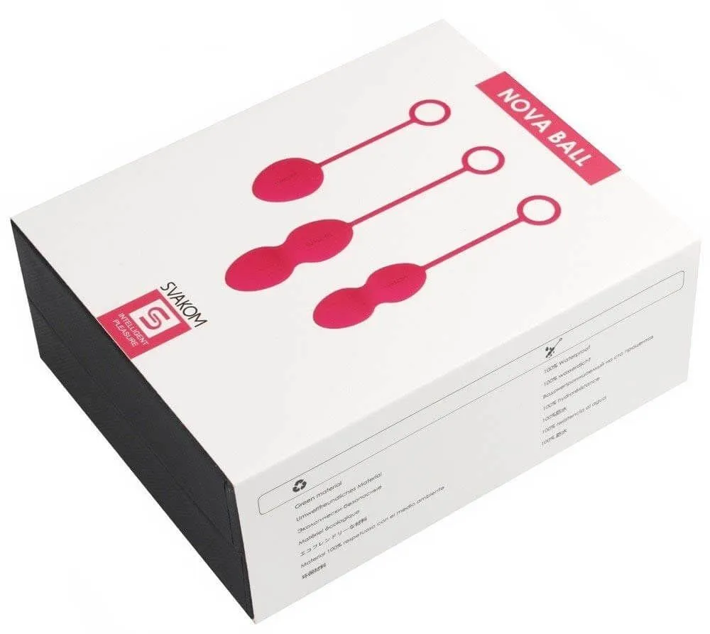 Вагинальные шарики Svakom Nova Ball разработаны для упражнений Кегеля. Набор включает в себя три различных шарика с разными размерами и разным весом. Каждый шарик сделан из 100% медицинского силикона и оснащен специальным колечком для легкого извлечения. Внутри каждого шарика есть подвижный металлический шарик, который будет создавать вибрации при каждом Вашем движении. Силиконовые шарики будут выскальзывать, однако под воздействием этих небольших вибраций Ваши мышцы будут сокращаться и препятствовать их выпадению. Дизайн шариков учитывает анатомию женского тела, что делает этот набор очень комфортными и удобными в использовании.