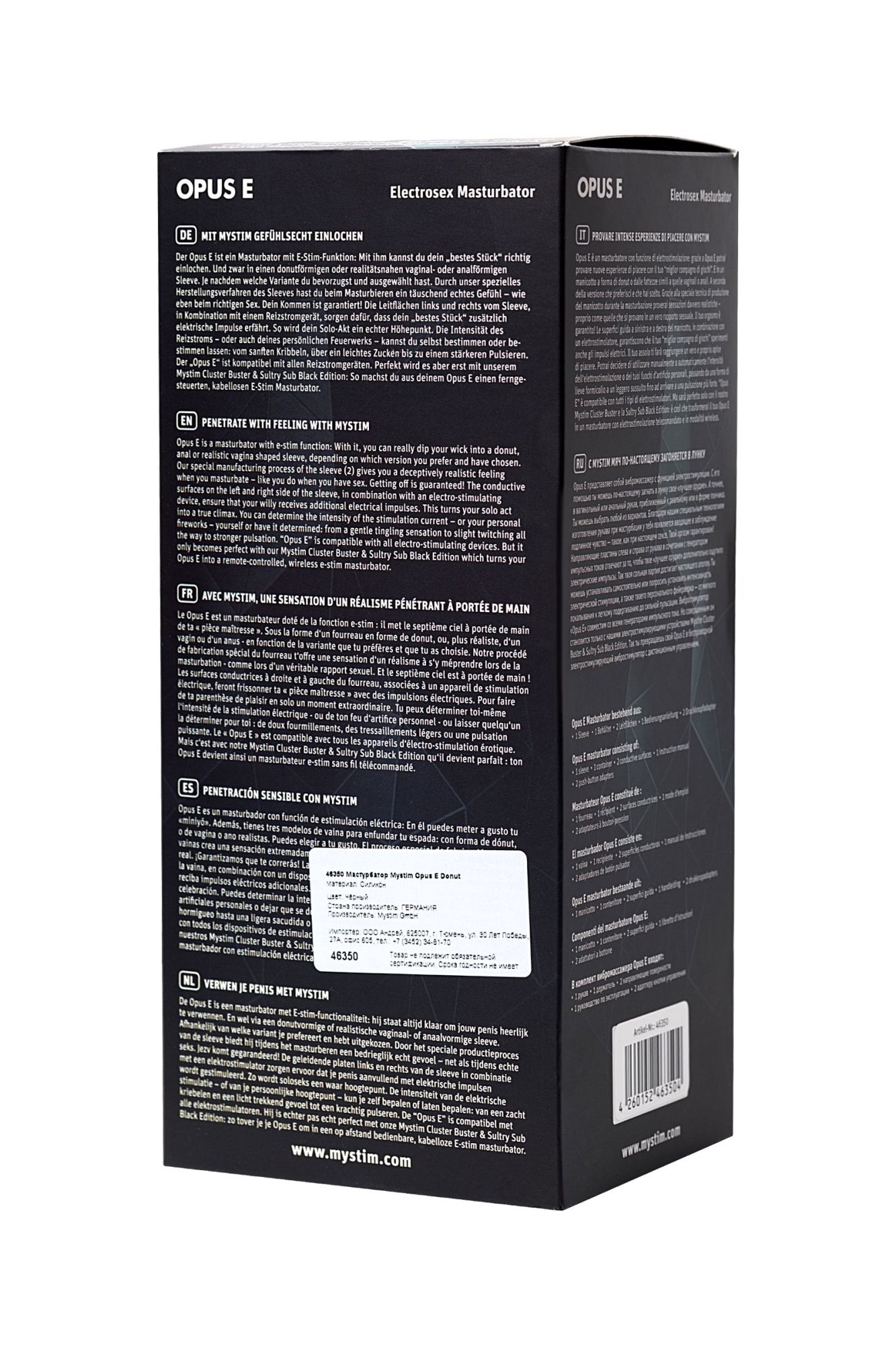 Внутренний материал — нежный, гибкий TPE телесного цвета, который ощущается, как настоящая кожа. Модель совместима с электростимуляторами Mystim Cluster Buster и Sultry Sub Black Edition. При подключении к одному из этих блоков возникают импульсы, которые могут варьироваться от легких покалываний до мощной пульсации. Такой подход позволяет разнообразить мастурбацию, подстроиться под настроение и ритм.