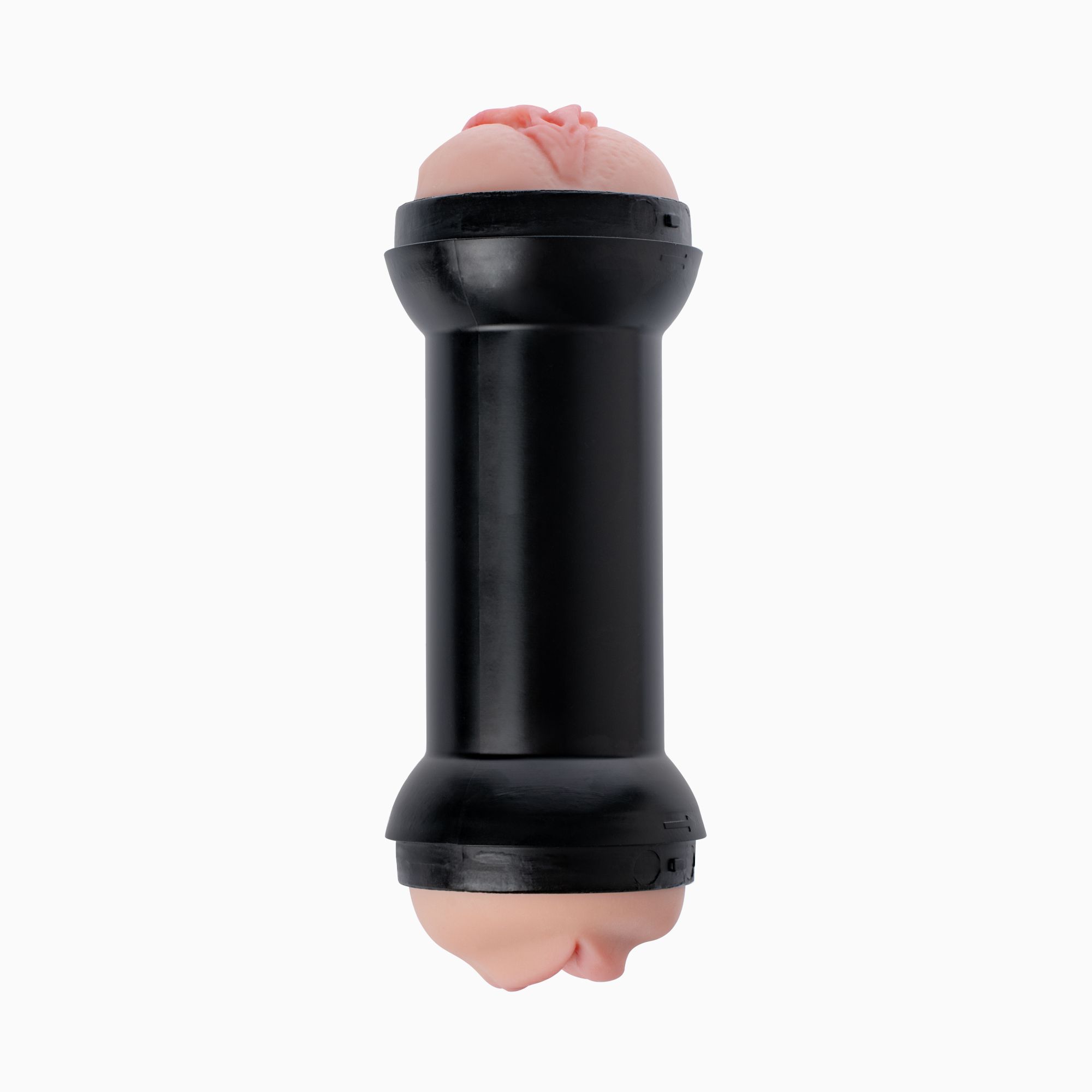 Мастурбатор с двумя отверстиями с разных сторон: с одной - вагина, с другой - ротик. Изделие помещено в жесткую колбу черного цвета.