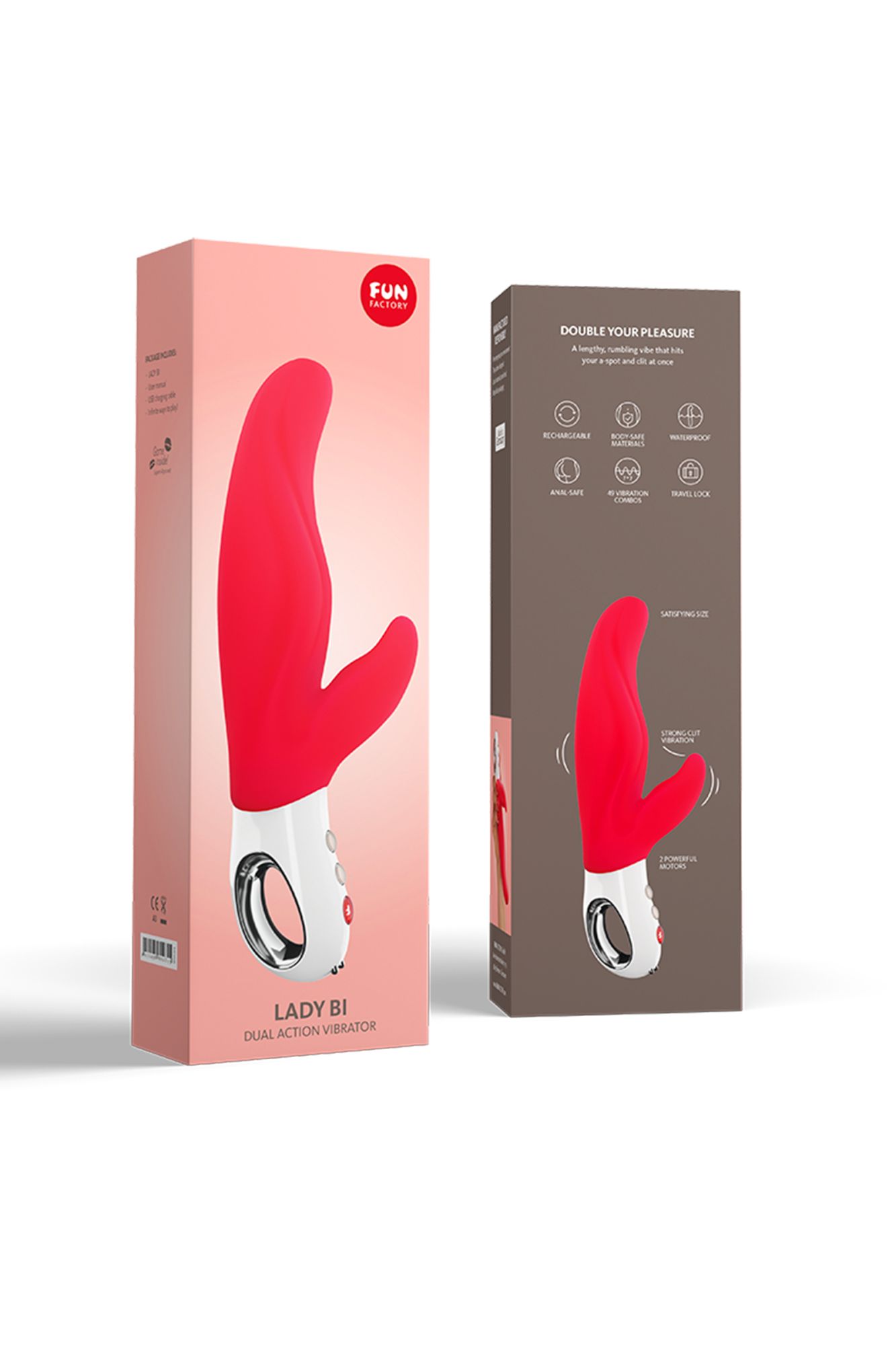 Изысканный вибратор двойного действия, выдержанный по размеру, удовлетворяющему ваши потребности Стимулирует область за шейкой матки, т.н. точку «А», что ведет к еще большему возбуждению и выделению смазки Использование технологии FlexiFUN Technology™ обеспечивает максимальное прилегание к телу Два моторчика создают объемную, глубоко проникающую вибрацию Перезаряжаем Изготовлен из безопасного для тела силикона Водонепроницаемый