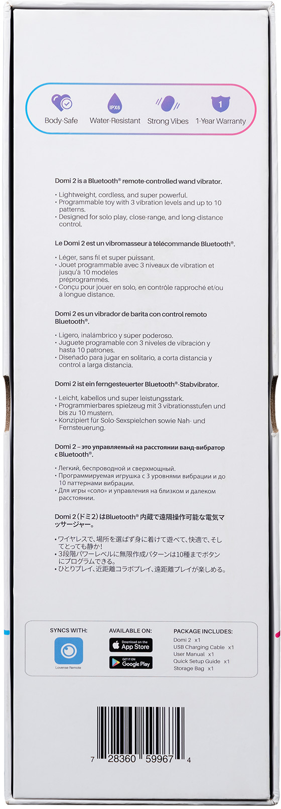Этот ванд-массажер идеально сочетает в себе мощность, функциональность и безопасность. С широким спектром паттернов интенсивности и вибрации помимо предустановленных 10 паттернов вибраций и 3-х уровней интенсивности, Domi 2 позволяет настроить уровень мощности, который соответствует вам наилучшим образом. Используйте его для достижения множества интенсивных оргазмов и управляйте им на расстоянии благодаря функциям приложения Lovense Remote и подключению с антенной новейшей технологии и чипом Bluetooth. Вы можете настроить вибрацию на нужный вам уровень - от "легкого" до "землетрясения" - и программировать его на кнопки игрушки. А можете управлять им на любом расстоянии, наблюдая за удовольствием на лице вашего партнера даже во время видеозвонка. С Domi 2 вы легко контролировать давление и наслаждение, используя опциональное световое кольцо на игрушке, чтобы уведомить своего партнера на расстоянии. Вы также можете синхронизировать вибрации с музыкой на вашем телефоне и наслаждаться непредсказуемыми ощущениями.