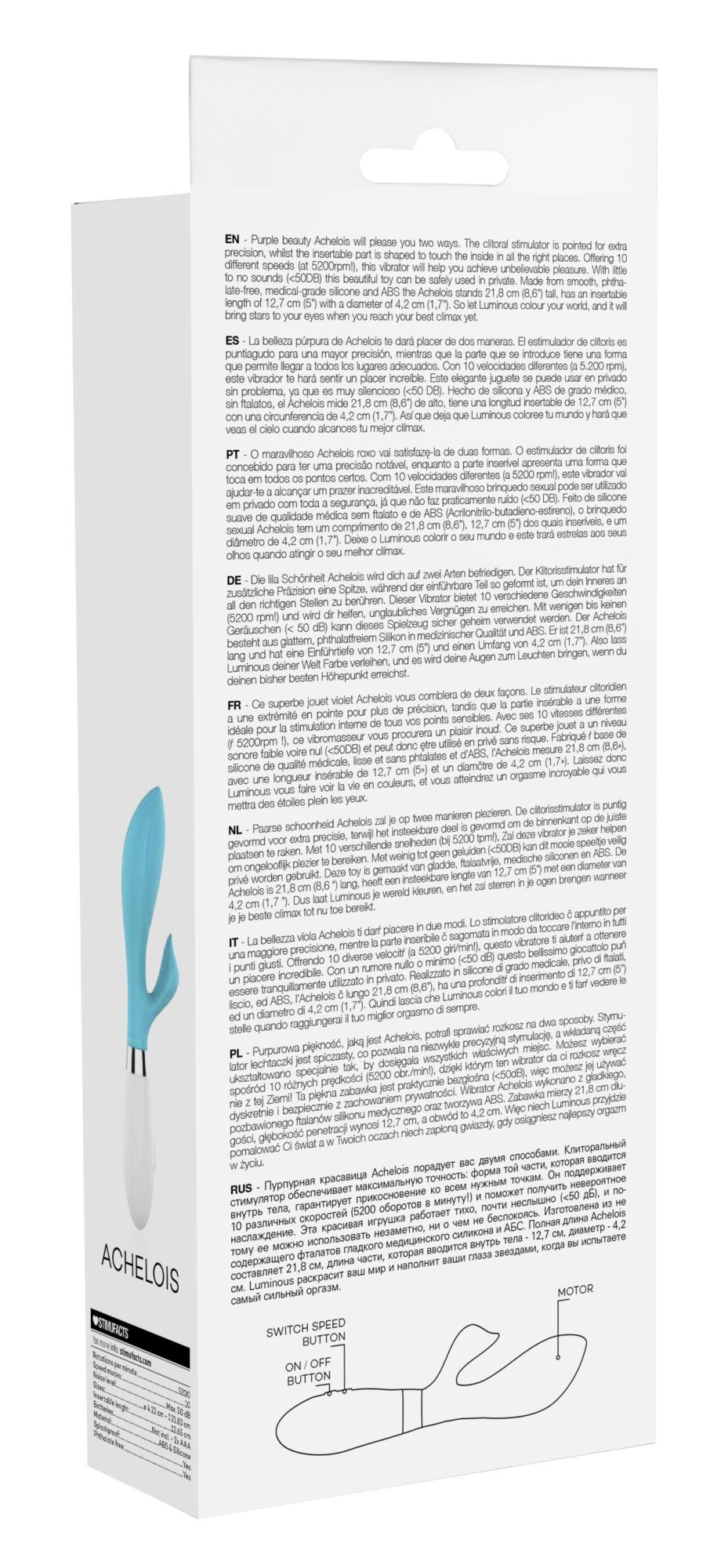 Вибратор-кролик – Achelois имеет округлую утолщённую головку и гибкий клиторальный отросток, что делает стимуляцию более яркой. Вибромассажер имеет два мощных двигателя, по одному в каждом отростке, имеющих 10 функций вибрации, способной достигать на вагинальном стволе до 7000 и на клиторальном отростке до 5200 оборотов в минуту, при этом уровень звука не превышает 50 дБ.