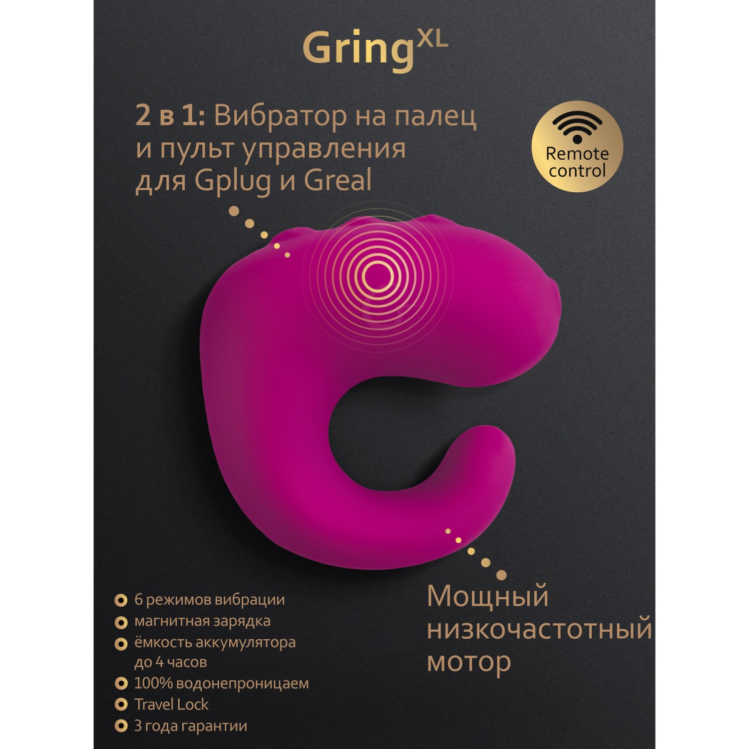 Другое назначение Gring - пульт управления другими продуктами Gvibe, например анальными пробками или реалистиками. Ты можешь настроить Gring так, чтобы исключительно подавать с него команды, а можешь создать дуо: пробка и второй девайс будут вибрировать в унисон, чтобы ты могла наслаждаться действительно объемными ощущениями.