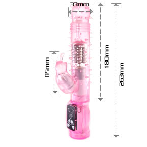 Вибромассажер с функцией вращения ствола и клиторальным стимулятором в виде зайчика. Имеет 6 режимов вибрациии и вращения. Данные режимы можно совмещать .Мягкий, по всей поверхности мягкие пупырышки. Материал изготовления- ТРЕ ( гель). Работает от трех батареек типа ААА (нет в комплекте). Общая длина 22,5 см, рабочая длина 11,5 см, максимальный диаметр 3 см, длина стимулятора 5 см, диаметр 2,5 см. Упаковка- прозрачный пластик.