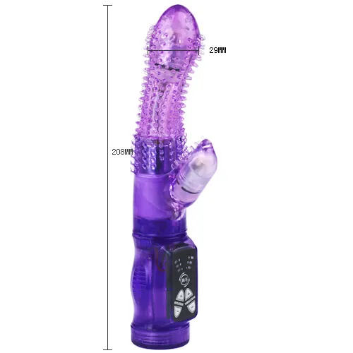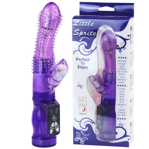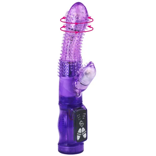 Вибромассажер с функцией вращения ствола и клиторальным стимулятором. Имеет 3 режима вибрациии и 3 режима вращения. Данные режимы можно совмещать .По всей рабочей поверхности имеет мягкие шипы для наилучшей стимуляции. Материал изготовления-ПВХ( гель). Работает от 3-х батареек типа ААА (нет в комплекте). Общая длина 20,5 см, рабочая длина 10 см, максимальный диаметр 3 см, длина стимулятора 3 см, диаметр 2 см. Упаковка- коробка с принтом.