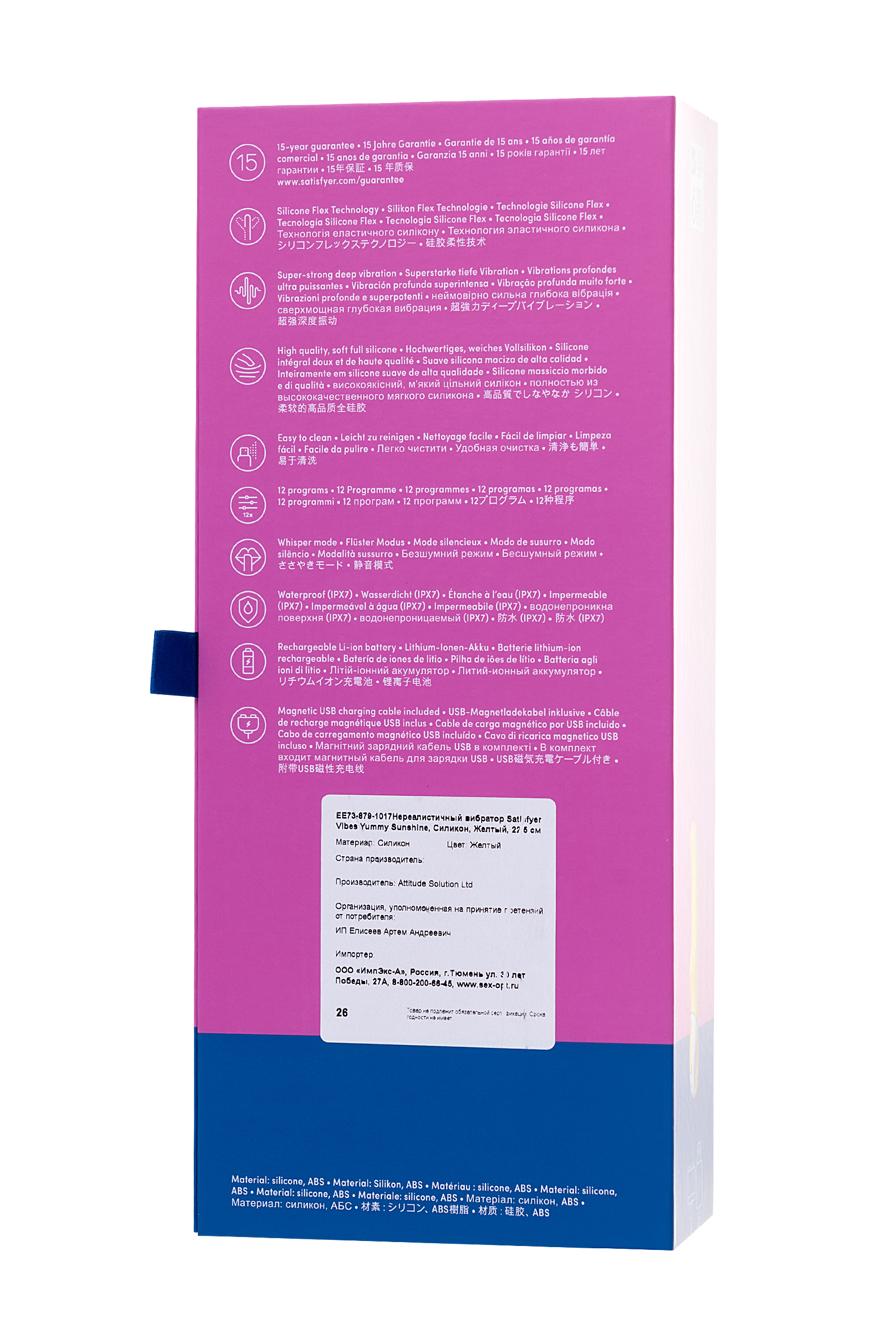 Озорной цвет, дразнящие воображение рельефы, гибкий ствол, 2 мощных мотора и яркая способность безукоризненно стимулировать точку G — нереалистичный вибратор Satisfyer Vibes Yummy Sunshine поднимает настроение и заставляет сиять ваше солнце. Давайте посмотрим, как он это делает. Плавно изогнутая головка и гибкий ствол соблазнительно массируют точку G и повышают градус возбуждения до рекордных отметок. Широкое основание ствола с ощутимым выступом уделяет должное внимание входу во влагалище, усиливая ваше наслаждение. Рельефные волны на стволе дополнительно прорабатывают чувствительные зоны. Шелковистый на ощупь силикон мощно и объемно передает 12 программ головокружительной вибрации, чтобы вы смогли прочувствовать каждый оттенок интимной игры — от игривой прелюдии до энергичной разрядки. 2 мотора идеально точно распределяют сильную вибрацию по всей длине игрушки, помогая датчикам удовольствия зашкаливать от накатывающих эмоций. Полная водонепроницаемость позволяет вибратору сиять для вас не только в спальне, но и в бодрящем душе или расслабляющей ванне. Эргономичная ручка-кольцо со встроенной панелью гарантирует комфортное управление легким нажатием кнопки. Satisfyer Vibes Yummy Sunshine — пусть ярче светит солнце!