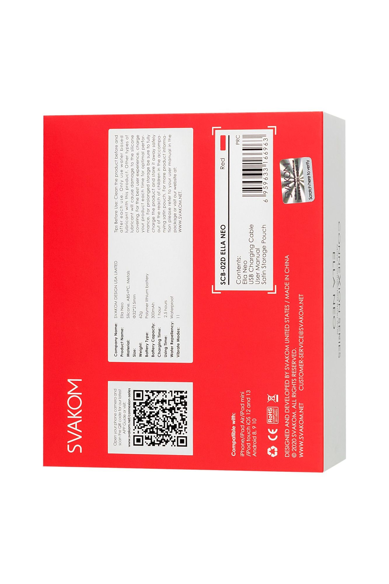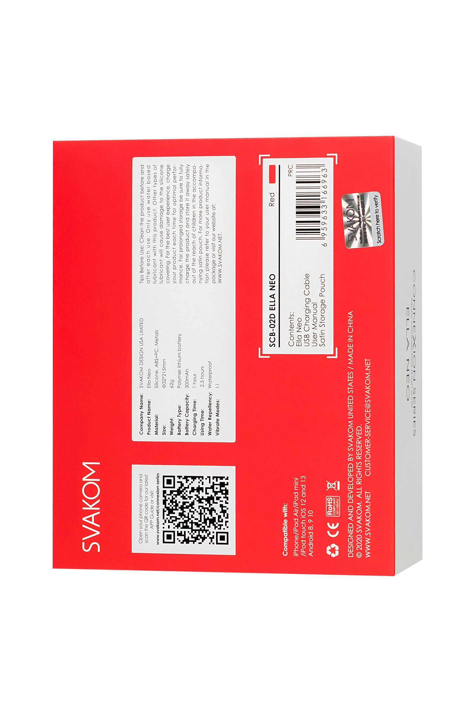 Svakom Ella Neo – управляемая с помощью приложения Bluetooth вибропуля, с элегантными формами и эргономичным дизайном. Используйте девайс вручную или с помощью приложения, играйте в одиночку или отдайте управление вашему партнеру! Выбирайте среди мягких и нежных вибраций или суперинтенсивных. В любом случае, у вас есть множество вариаций достичь удовольствия. Игрушка полностью водонепроницаема, а благодаря небольшим размерам ее очень удобно брать с собой в любые поездки. 1 час зарядки подарит вам целых 2 часа удовольствия. 11 режимов вибрации (10 авто +1 пользовательский режим через приложение) позволяют выбрать то, чего хотите именно вы. Если вы хотите использовать классические режимы или синхронизировать вибрацию с музыкальными треками – функциями можно управлять через Svakom App. Если интересна тема теледильдоники, хочется попробовать игрушку с управлением на расстоянии, попробовать синхронизировать вибрацию с любимым порно-роликом, то тогда управлять можно через Feel Connect 3. Svakom Ella Neo - это воплощение заботы, элегантности, моды и интеллекта. Материал: безопасный для тела силикон + ABS Режимы вибрации: 11 Размер: 3,3 см × 21,5 см Вес: 60 г Цвет: красный Заряжается: USB Время зарядки: 1 час Используемое время: 2 часа Водонепроницаемость: IPX6 Интерфейс: Bluetooth В комплекте: Вибропуля Ella Neo, мешочек для хранения, зарядный кабель USB, гарантийный талон, руководство. Страна бренда: США