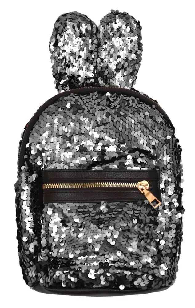 Этот яркий и стильный рюкзачок черного цвета выполнен из искусственной кожи и украшен переливающимися на свету пайетками и милыми крольчьими ушками. Он будет служить Вам как удобный аксессуар для переноса небольших вещей, а также удачно дополнит Ваш образ. Такой рюкзачок незаменим в путешествиях, ведь в него отлично поместятся все важные вещи - документы, телефон, деньги, ключи. Также его можно взять с собой на вечеринку или какой-либо фестиваль.